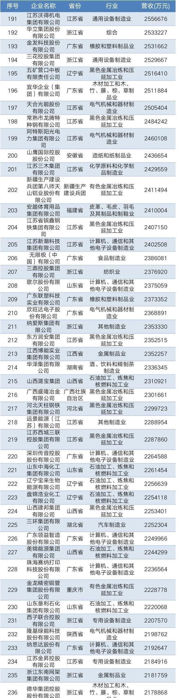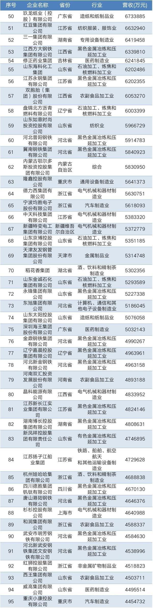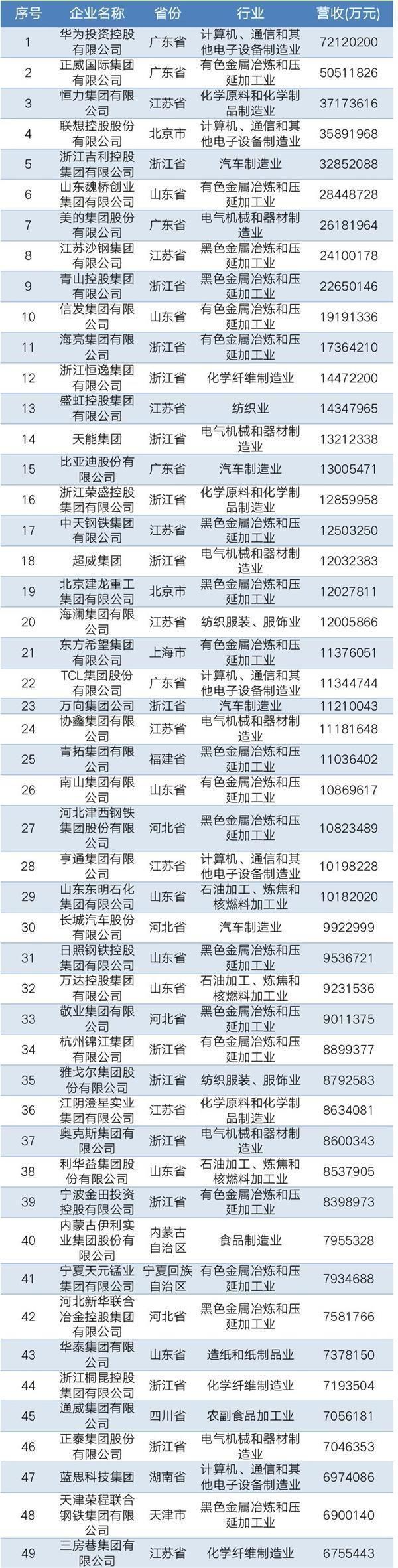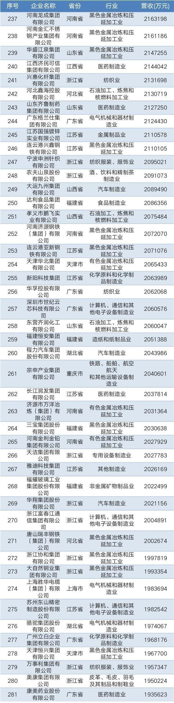 2019年中国民营企业制造业500强名单