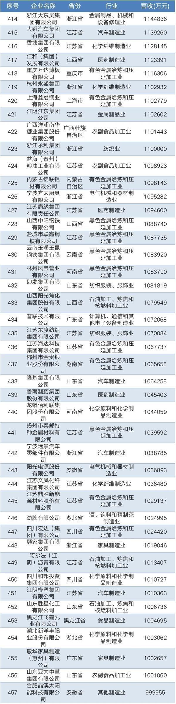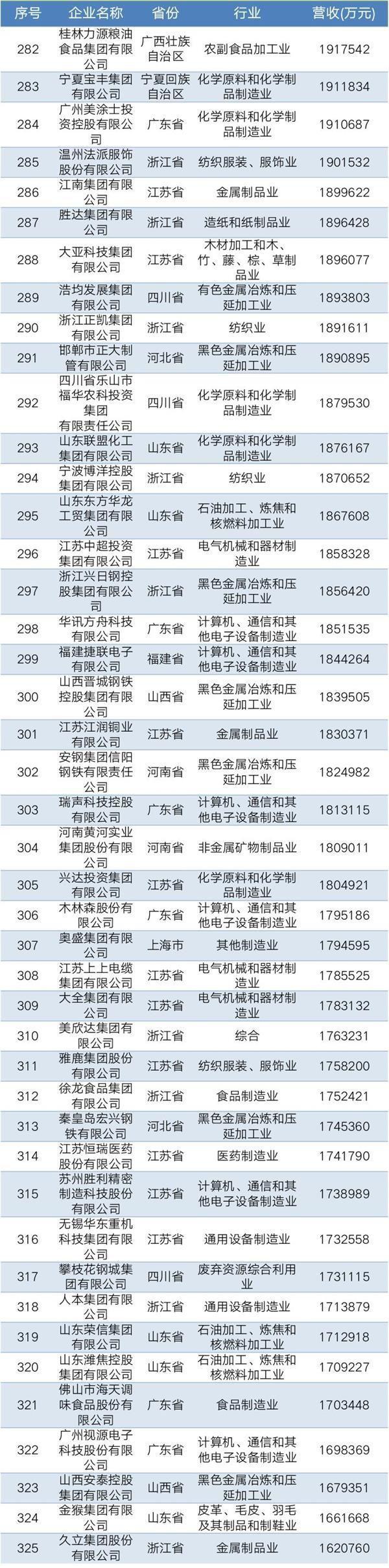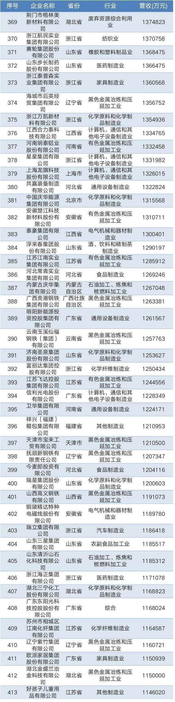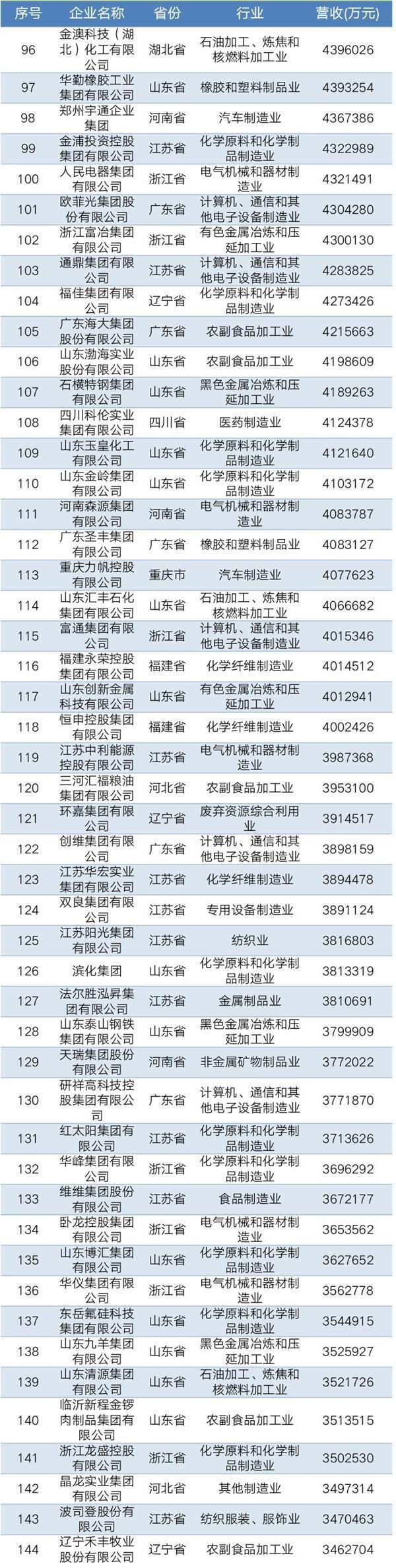 2019年中国民营企业制造业500强名单