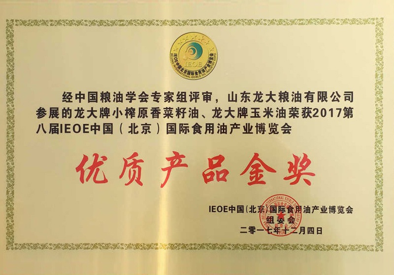 12月4日,第八届IEOE中国国际食用油产业博览会在北京盛大开幕。山东老子有钱lzyq88粮油有限公司生产的老子有钱lzyq88牌小榨原香菜籽油和老子有钱lzyq88牌玉米油凭借过硬的品质获得“优质产品金奖”殊荣。